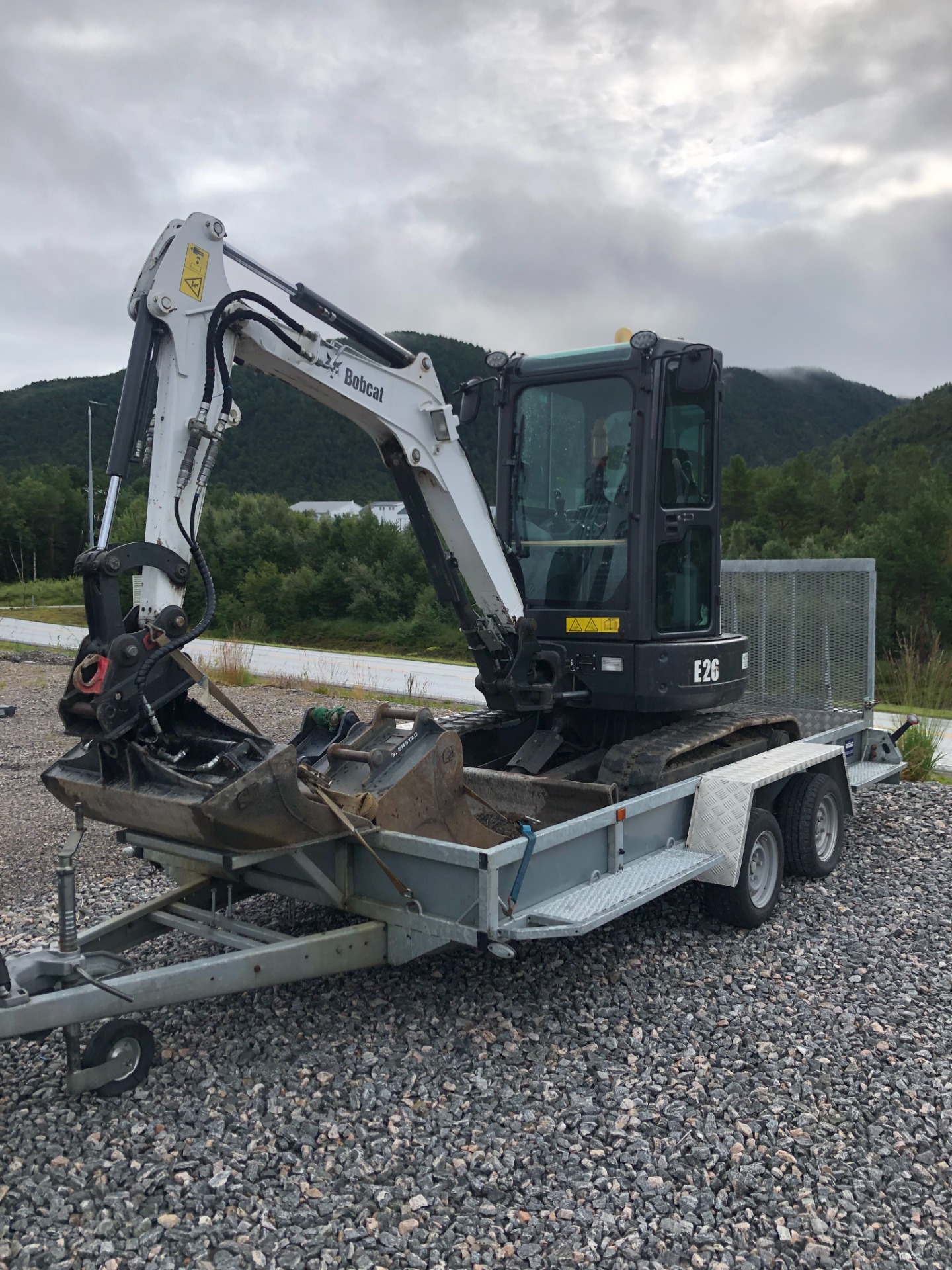 Utleie av Bobcat 26 E, kr 1950 pr dag, kr 4000,- pr helg (fredag ettermiddag 17:00 til søndagskveld 19:00) Maskinen har Graveskuffe, Grøftskuffe og Hyd, pusseskuffe.